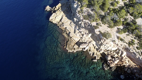 Wir nähern uns der Küste vor Sa Pedrera (Atlantis), dem alten Steinbruch von Ibiza.